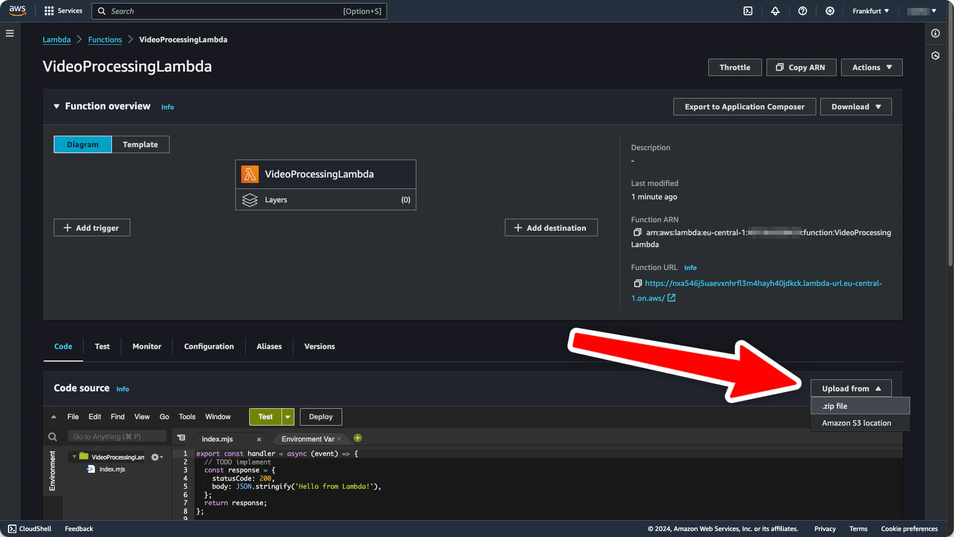 deploy the code to AWS. Select lambda.zip as upload file.